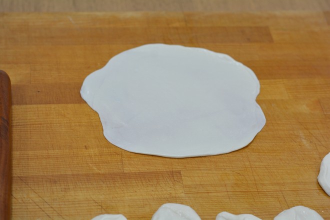 7.將另一個(gè)沒(méi)刷油的面皮摞在刷油的上面,先用搟面杖隨意按壓幾下,再搟成薄薄的面片;不介意模樣到這一步就可以去蒸了,如果想要每張餅都一樣大小,可以多出下一步;