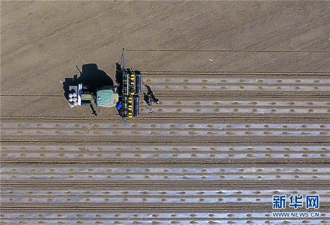 在新疆生產(chǎn)建設(shè)兵團(tuán)第六師共青團(tuán)農(nóng)場的棉花地中,一名農(nóng)場職工在一輛裝有北斗導(dǎo)航系統(tǒng)的多功能一體化無人駕駛精量播種機(jī)后檢查地膜鋪設(shè)情況(4月19日攝)。