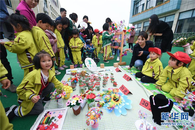 當(dāng)日,浙江省長(zhǎng)興縣畫溪街道包橋中心幼兒園舉辦校園義賣節(jié)。10多個(gè)攤位上擺放著家長(zhǎng)和孩子一起用廢舊的玻璃瓶、雪糕棍、紙盒、紐扣等廢舊材料制作而成的小木屋、迷你小盆栽、紐扣花束、風(fēng)車等手工作品,孩子們以班級(jí)為單位進(jìn)行手工作品義賣,所得款項(xiàng)將全部用于社區(qū)公益環(huán)?;顒?dòng)。主辦方介紹,希望通過這樣的活動(dòng),倡導(dǎo)廢物利用和綠色低碳的生活理念。