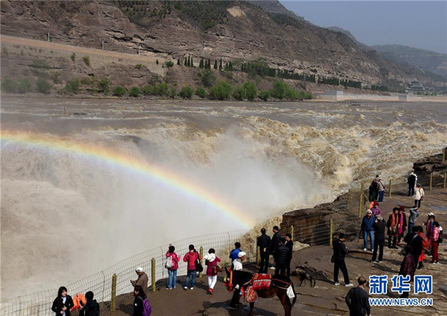 4月29日,游客在山西省臨汾市吉縣黃河壺口瀑布景區(qū)游覽。 近日,受上游降雨和水庫(kù)調(diào)節(jié)放水影響,晉陜交界的黃河壺口瀑布再現(xiàn)壯美瀑布群景觀。 新華社發(fā)(呂桂明攝)