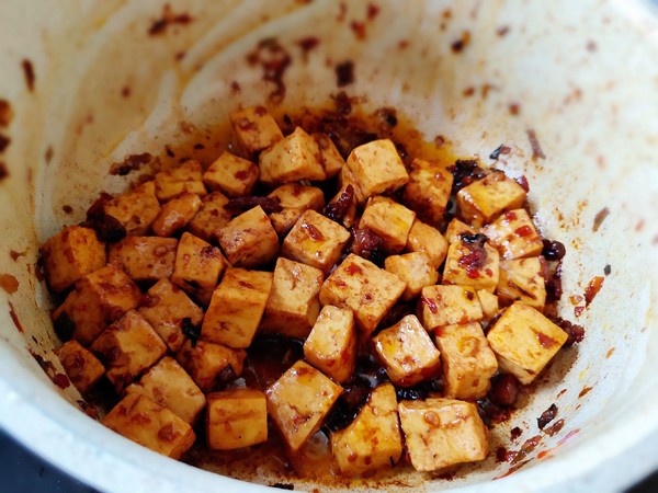 1.豆腐切成小塊兒,焯水后撈出控水備用。