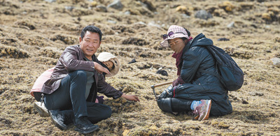 崔久鄉(xiāng)的拉姆(右一)等牧民,在剛?cè)谘┎痪玫纳狡虏莸厣蠈ふ蚁x(chóng)草。 |