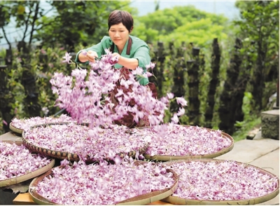 近日,貴州省赤水市的金釵石斛花陸續(xù)進入盛花期。據(jù)了解,金釵石斛是一種名貴中藥材,有“仙草”之稱。近年來,赤水市多個鄉(xiāng)鎮(zhèn)積極推進農(nóng)業(yè)與鄉(xiāng)村旅游等產(chǎn)業(yè)融合,采取“合作社+支部+農(nóng)戶”模式,鼓勵農(nóng)民種植金釵石斛,助力脫貧攻堅和鄉(xiāng)村振興。圖為一名當?shù)剞r(nóng)婦在晾曬剛采摘的金釵石斛鮮花。王長育攝(新華社發(fā))