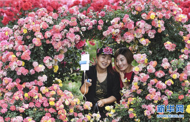 5月16日,游人在新下社區(qū)扶貧產業(yè)園月季苗圃自拍。 新華社記者 陶明 攝