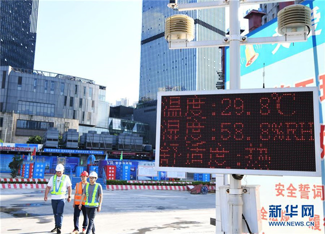 這是6月5日在重慶化龍橋超高層項目施工現(xiàn)場拍攝的環(huán)境監(jiān)測系統(tǒng)顯示屏。新華社記者 王全超 攝