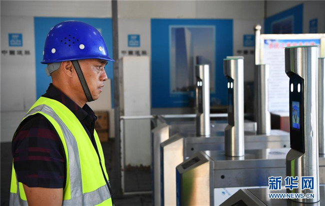 6月5日,重慶化龍橋超高層項目工人通過人臉識別系統(tǒng)離開工地。 新華社記者 王全超 攝