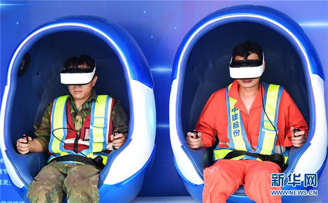 6月5日,重慶化龍橋超高層項目工人在VR安全體驗館內(nèi)體驗“高空墜落”。在VR安全體驗館,工人們可通過VR游戲的方式親身體驗高空墜落、消防事故處置等項目,了解施工過程中可能遇到的危險、困難以及解決方法。 新華社記者 王全超 攝