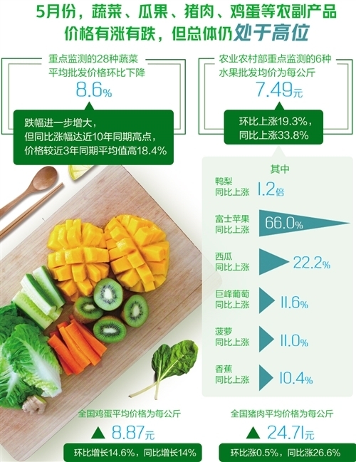 從數(shù)據(jù)來(lái)看,雖然5月份蔬菜、瓜果、豬肉、雞蛋等農(nóng)副產(chǎn)品價(jià)格有漲有跌,但總體仍處于高位。