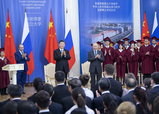 當(dāng)?shù)貢r(shí)間6月6日,又一場特殊儀式在圣彼得堡國立大學(xué)舉行。習(xí)近平被授予圣彼得堡國立大學(xué)名譽(yù)博士學(xué)位。他在答辭中說道,這既是雙方教育和人文領(lǐng)域密切交流的例證,更是中俄關(guān)系高水平的重要體現(xiàn)。他同時(shí)希望雙方不斷擴(kuò)大教育領(lǐng)域交流合作。