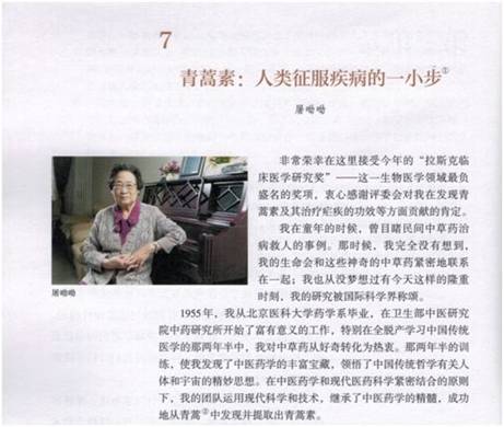 據(jù)悉,今年秋季學(xué)期將開始推廣的統(tǒng)編高中語文教材已確定將屠呦呦2011年的獲獎感言及同年發(fā)表的論文改編成課文《青蒿素:人類征服疾病的一小步》。人民教育出版社有關(guān)負(fù)責(zé)人介紹,屠呦呦在青年時期培養(yǎng)了對傳統(tǒng)醫(yī)藥學(xué)的熱愛,歷經(jīng)數(shù)年終于從古代藥典中獲得靈感,發(fā)現(xiàn)了青蒿素,并且至今仍在科學(xué)探索道路上孜孜以求。此次選錄這篇文章,旨在引導(dǎo)學(xué)生了解和尊重科學(xué),從屠呦呦的科研歷程中汲取力量。