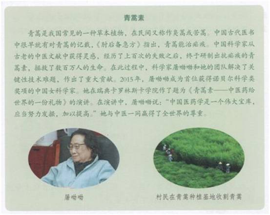 此外,初中歷史教材也在《中國歷史》八年級下冊第18課“科技文化成就”中,對屠呦呦科研團(tuán)隊先進(jìn)事跡進(jìn)行了專題介紹。