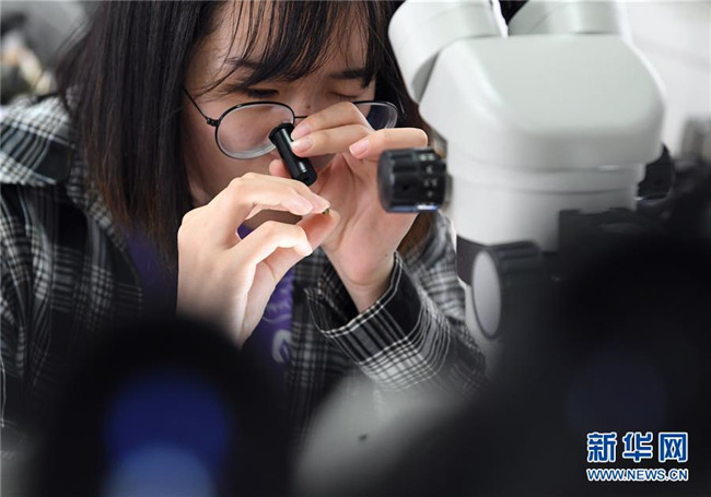 在長安大學(xué)珠寶鑒定實(shí)驗(yàn)室,地質(zhì)學(xué)專業(yè)寶玉石學(xué)與珠寶鑒定方向的學(xué)生在觀測樣本(5月28日攝)。新華社記者張博文攝