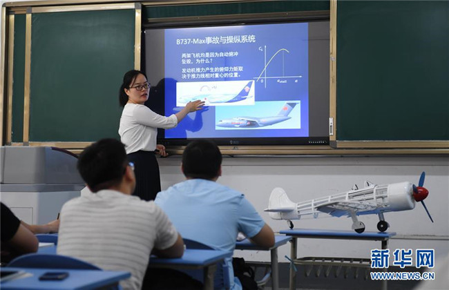 在西北工業(yè)大學(xué)航空學(xué)院,副教授劉艷在飛行器設(shè)計與工程專業(yè)的飛行動力學(xué)課程上分析波音客機(jī)墜毀原因(6月14日攝)。新華社記者李一博攝