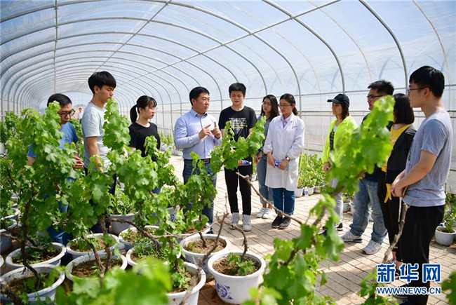 西北農(nóng)林科技大學(xué)葡萄酒學(xué)院院長房玉林(左四)在為該院學(xué)生講解葡萄種植(5月24日攝)。新華社記者邵瑞攝