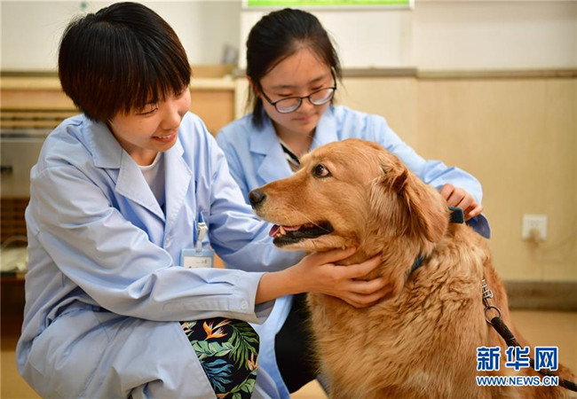 西北農(nóng)林科技大學(xué)動物醫(yī)學(xué)專業(yè)學(xué)生在學(xué)校的動物醫(yī)院內(nèi)安撫一只寵物狗(5月25日攝)。新華社記者邵瑞攝