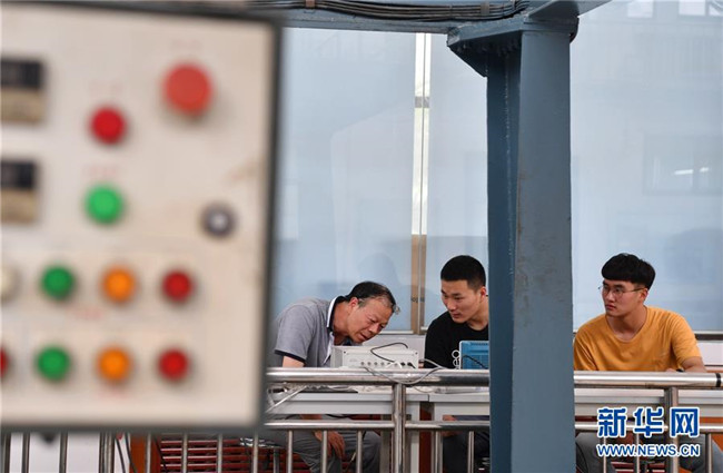 在西北工業(yè)大學(xué)航海學(xué)院消聲水池實(shí)驗(yàn)室,教師張爭氣(左一)正在指導(dǎo)學(xué)生進(jìn)行測量實(shí)驗(yàn)(6月17日攝)。新華社記者張博文攝