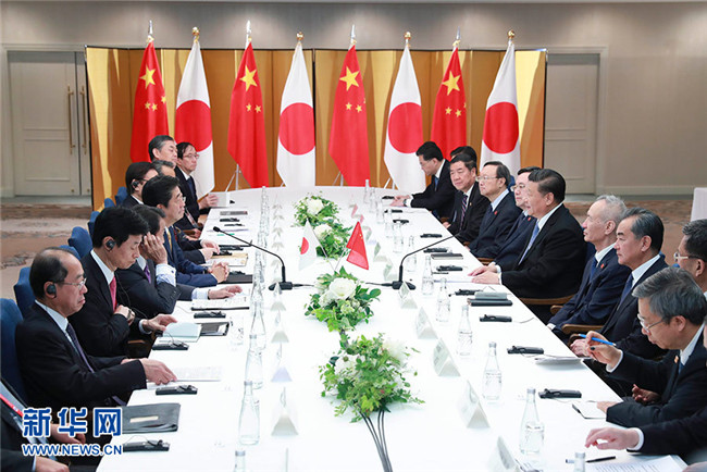 習(xí)近平強(qiáng)調(diào),雙方要始終恪守中日四個(gè)政治文件確立的各項(xiàng)原則,踐行中日“互為合作伙伴、互不構(gòu)成威脅”的政治共識,增進(jìn)互信,推動(dòng)中日關(guān)系始終沿著和平、友好、合作的正確軌道持續(xù)向前發(fā)展。要深化經(jīng)貿(mào)、投資、第三方市場、科技創(chuàng)新等廣泛領(lǐng)域合作,打造新的合作增長點(diǎn),積極引領(lǐng)區(qū)域經(jīng)濟(jì)一體化。我們歡迎日本企業(yè)積極擴(kuò)大對華合作,分享中國發(fā)展新機(jī)遇。共建“一帶一路”倡議為中日互利合作開辟了廣闊天地,歡迎日方積極參與。雙方要拉緊人文紐帶,加強(qiáng)兩國青少年交流,促進(jìn)兩國民眾相知相親。我贊同年內(nèi)啟動(dòng)中日高級別人文交流磋商機(jī)制。要通過對話協(xié)商建設(shè)性管控矛盾分歧,加強(qiáng)外交和安全領(lǐng)域?qū)υ?,?gòu)建建設(shè)性雙邊安全關(guān)系。希望日方恪守迄今共識和承諾,妥善處理好歷史等敏感問題,共同維護(hù)東海和平穩(wěn)定。中日應(yīng)該加強(qiáng)在國際和地區(qū)事務(wù)中的溝通、協(xié)調(diào)、合作,共同應(yīng)對全球性挑戰(zhàn),推動(dòng)全球治理更加公正合理。中方支持日方辦好二十國集團(tuán)領(lǐng)導(dǎo)人大阪峰會,期待峰會發(fā)出維護(hù)多邊主義和自由貿(mào)易的明確聲音,為世界經(jīng)濟(jì)發(fā)展注入穩(wěn)定預(yù)期和動(dòng)力。