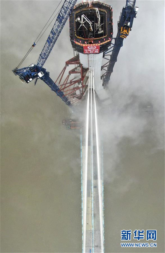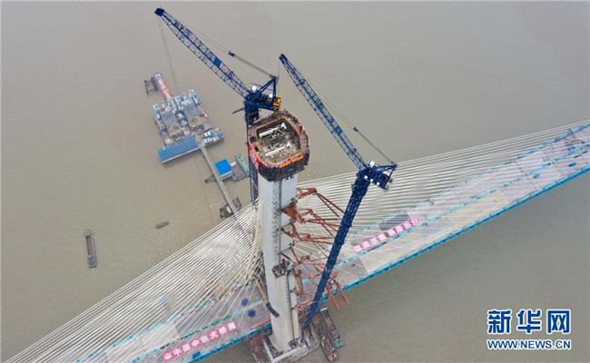 當(dāng)日,滬通長江大橋南主塔順利封頂。至此,該橋兩座高達(dá)330米的主塔全部建成,標(biāo)志著世界最大跨度公鐵兩用斜拉橋建設(shè)取得了關(guān)鍵性進(jìn)展。滬通長江大橋全長11072米,主橋長2296米,主跨1092米,是滬通鐵路全線的控制性工程,設(shè)計(jì)為上層6車道高速公路,下層4線鐵路。新華社發(fā)(許叢軍攝)