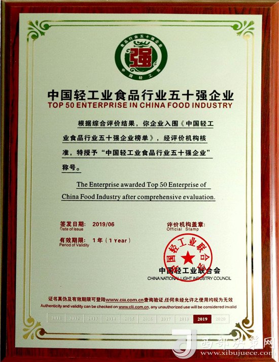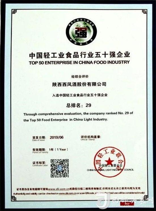 “中國輕工業(yè)食品行業(yè)五十強(qiáng)企業(yè)”榜單是評(píng)價(jià)輕工業(yè)食品企業(yè)競(jìng)爭(zhēng)力的權(quán)威榜單,也是衡量中國輕工業(yè)食品企業(yè)發(fā)展活力的重要標(biāo)準(zhǔn)。此次榜單在評(píng)選標(biāo)準(zhǔn)上重點(diǎn)考量了2018年度參評(píng)企業(yè)的營業(yè)收入、利潤總額、營業(yè)收入利潤率、稅收占利稅比重、研發(fā)投入及營業(yè)收入增速六項(xiàng)指標(biāo)綜合評(píng)分,力求結(jié)合互聯(lián)網(wǎng)時(shí)代特征對(duì)企業(yè)進(jìn)行充分全面的評(píng)估,要求企業(yè)不僅能夠?qū)崿F(xiàn)均衡發(fā)展,還要具備較強(qiáng)的市場(chǎng)活力。西鳳股份公司憑借出色的經(jīng)營業(yè)績(jī)和綜合表現(xiàn),獲得了大會(huì)的一致認(rèn)可。