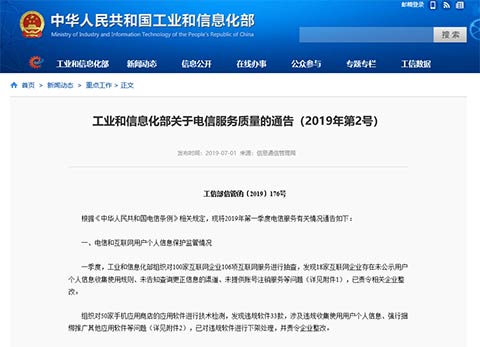 通告稱,一季度,工信部對100家互聯(lián)網(wǎng)企業(yè)106項互聯(lián)網(wǎng)服務(wù)進行抽查,發(fā)現(xiàn)18家互聯(lián)網(wǎng)企業(yè)存在未公示用戶個人信息收集使用規(guī)則、未告知查詢更正信息的渠道、未提供賬號注銷服務(wù)等問題,工信部已責(zé)令相關(guān)企業(yè)整改。