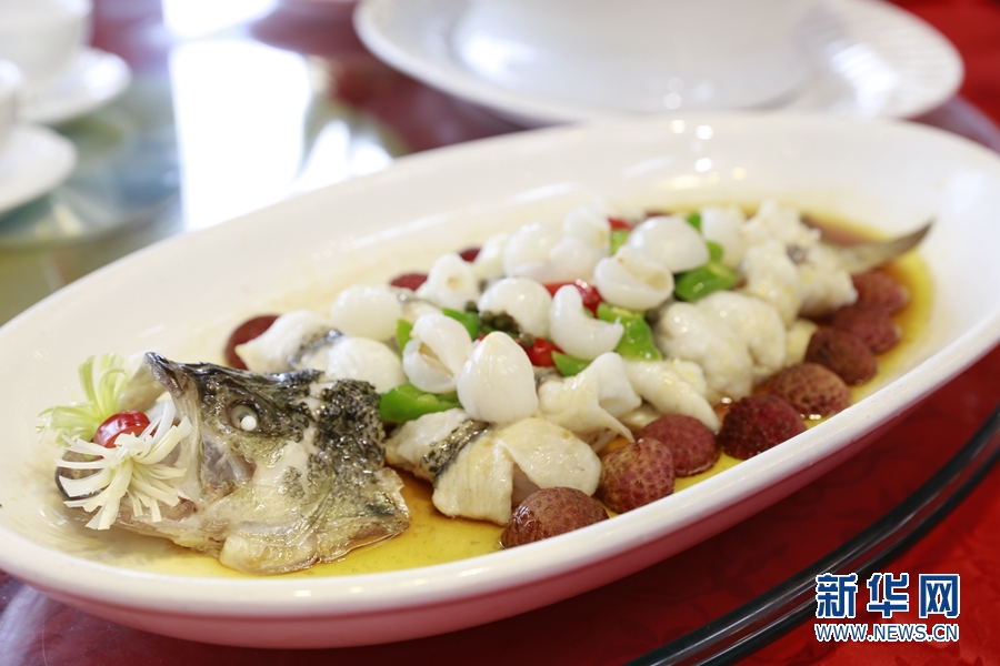 本次荔枝宴共有泮塘綠叢荔荷雞、魚潛荔水芳四溢,以及禾桿藏珠荔香透等10道菜肴。新華網(wǎng) 林曉蕾攝