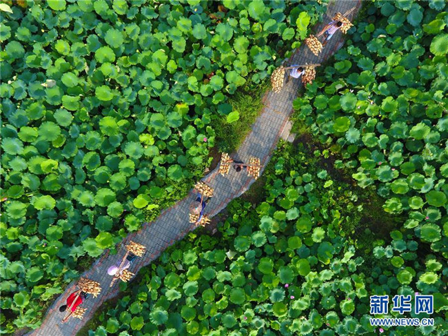 7月10日,在柳州市柳江區(qū)百朋鎮(zhèn),農(nóng)民挑著剛剛采收的蓮藕走在藕田里(無人機拍攝)。新華社記者 黃孝邦 攝