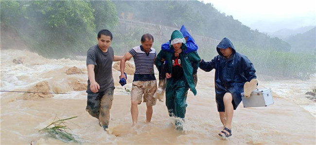九圩鎮(zhèn)紀委書記覃國富接到信息后,馬上帶著幾名黨員干部提著急救箱和救援物資出發(fā),并聯(lián)系了鎮(zhèn)衛(wèi)生院的救護車在未受淹的安全地帶等候,人員則徒步3公里進入內(nèi)興屯。