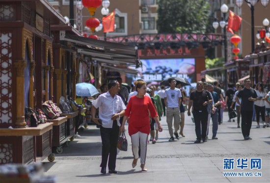 游客在新疆國際大巴扎景區(qū)步行街游覽(7月13日攝)。