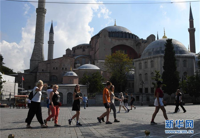 這是7月6日,在土耳其伊斯坦布爾,游客在阿亞索菲亞博物館附近游覽。新華社記者 徐速繪 攝
