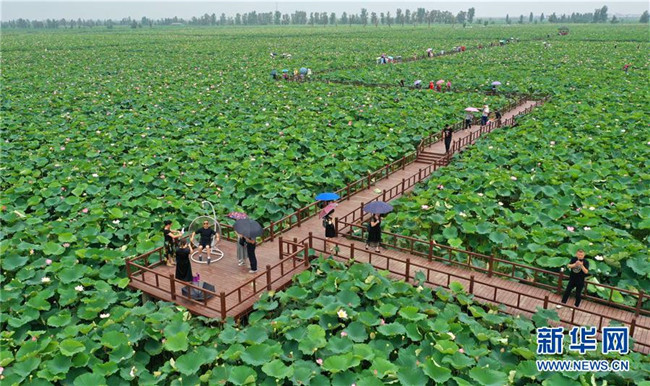 在江西省南昌市新建區(qū)聯(lián)圩鎮(zhèn),游客在當(dāng)?shù)氐那М€荷花園觀賞游玩(7月20日無人機拍攝)。