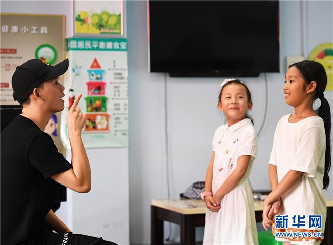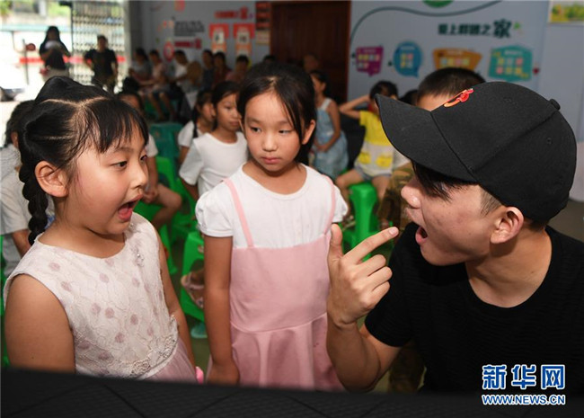 8月5日,培訓(xùn)班老師(左)在課堂上與小朋友們互動(dòng)。新華社記者 王全超 攝