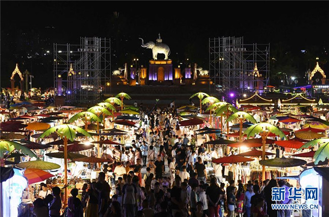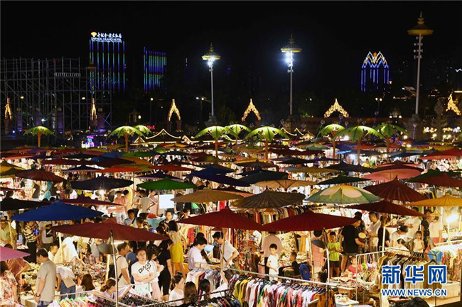8月16日,在西雙版納傣族自治州景洪市,游客在瀾滄江畔的夜市休閑購物。新華社記者 楊宗友 攝