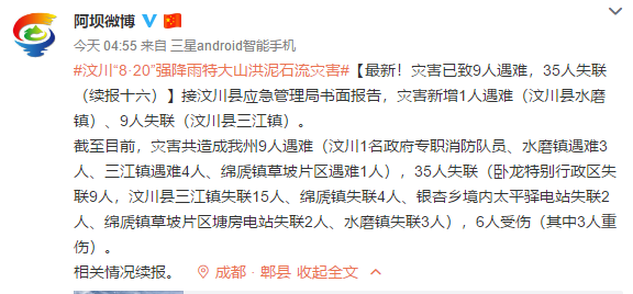 據(jù)阿壩州委外宣辦官方微博消息,接汶川縣應(yīng)急管理局書面報(bào)告,災(zāi)害新增1人遇難(汶川縣水磨鎮(zhèn))、9人失聯(lián)(汶川縣三江鎮(zhèn))。