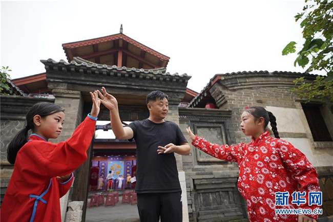 8月20日,河北省秦皇島市北戴河“裴艷玲藝術傳承基地”的老師在培訓孩子表演京劇。