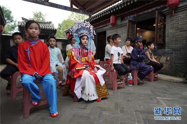 8月20日,孩子們在河北省秦皇島市北戴河“裴艷玲藝術傳承基地”觀看京劇表演。