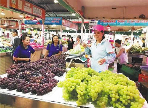 8月13日,廣西南寧市淡村農(nóng)貿(mào)市場,居民正在購買水果。本報記者 童 政攝
