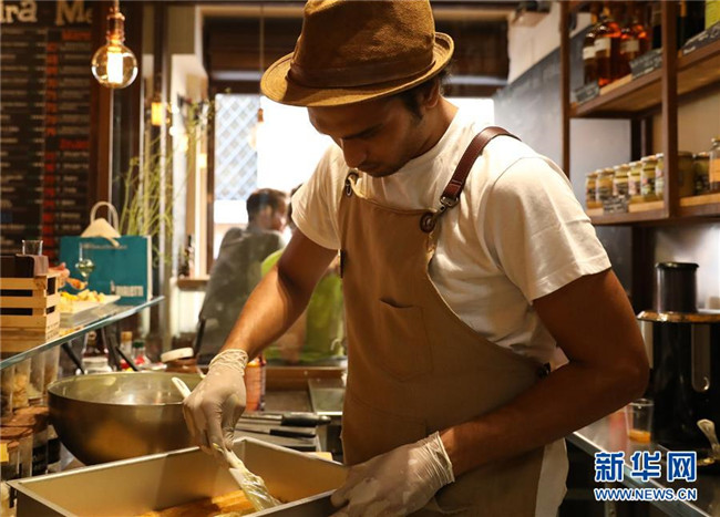 8月23日,在意大利首都羅馬的一家餐廳,一名廚師制作開(kāi)心果口味的提拉米蘇。