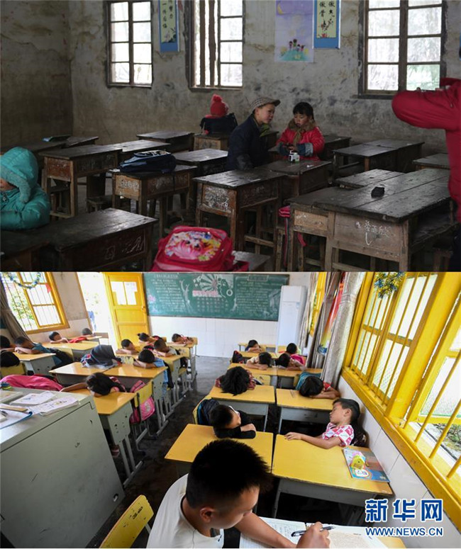 這是一張拼版照片。上圖:2014年2月14日拍攝的改造前的十八洞小學教室(資料照片);下圖:十八洞小學學生在改造后的教室睡午覺,老師(前)在一旁備課(9月5日新華社記者陳澤國攝)。新華社發(fā)