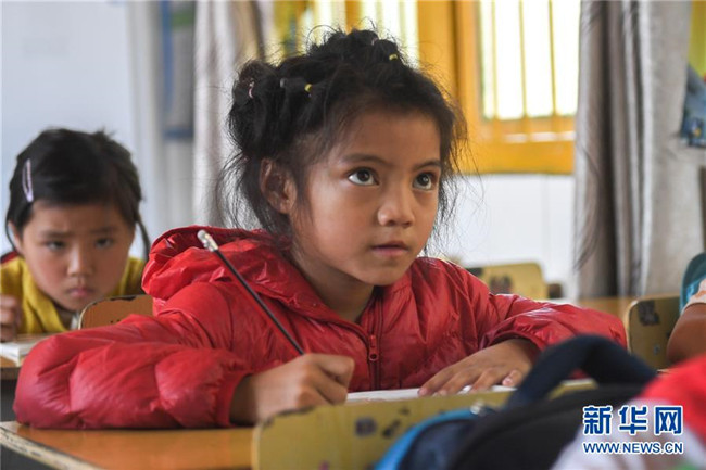 十八洞小學一年級學生施蓉婭在上課時認真聽講(9月4日攝)。新華社記者 陳澤國 攝