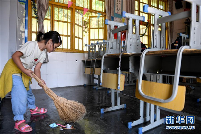 十八洞小學一年級學生楊韓雪在下課后打掃教室衛(wèi)生(9月4日攝)。 新華社記者 陳澤國 攝