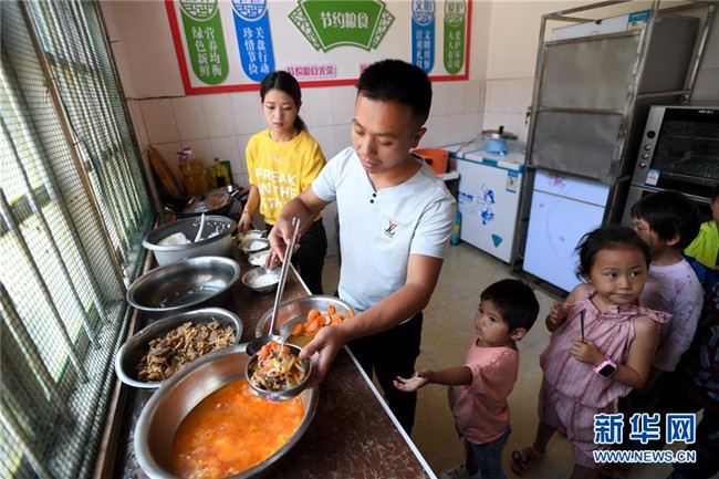 9月5日,十八洞小學學生在排隊等候老師盛飯菜。新華社記者 陳澤國 攝