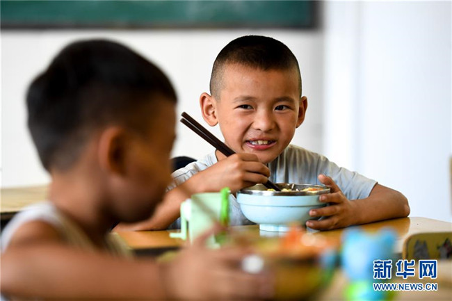 9月5日,十八洞小學學生在教室吃午飯。 新華社記者 陳澤國 攝