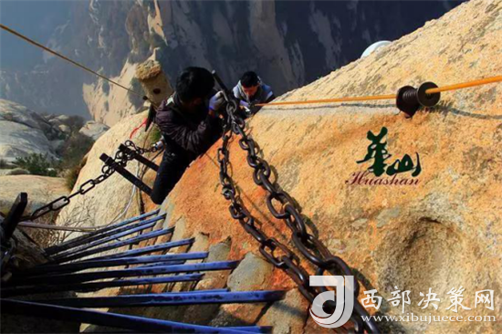 長空棧道位于華山南峰東側(cè)山腰,是華山派第一代宗師元代高道賀志真為遠(yuǎn)離塵世靜修成仙,在萬仞絕壁上鑲嵌石釘搭木椽而筑。棧道上下皆是懸崖絕壁,鐵索橫懸,由條石搭成尺許路面,下由石柱固定,游人至此,面壁貼腹,屏氣挪步,被譽(yù)為“華山第一天險(xiǎn)”。由于棧道險(xiǎn)峻,故當(dāng)?shù)厝擞?ldquo;小心九厘三分,要尋尸首,洛南商州”之說。這里只是探險(xiǎn)之道,并非登山必由之路,膽小人就在升表臺(tái)看看也就行了。所以石刻上不少警告之語:“懸崖勒馬”等。(供稿:華旅集團(tuán)營銷中心)