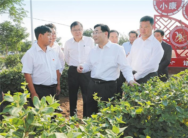 9月25日,省委書記胡和平來到蒲城縣堯山鎮(zhèn)閆家村金銀花現(xiàn)代農(nóng)業(yè)園區(qū),察看金銀花長勢,了解畝產(chǎn)、收益和帶動脫貧致富效果。記者 宋紅梅攝
