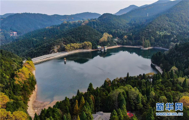 這是10月10日在廬山風(fēng)景區(qū)內(nèi)拍攝的蘆林湖(無人機拍攝)。新華社記者 胡晨歡 攝