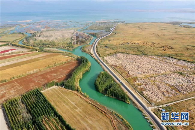 這是新疆博斯騰湖美景(10月12日無人機(jī)拍攝)。入秋以來,新疆博斯騰湖碧波蕩漾,美景如畫,吸引各地游客前來游玩。新華社記者丁磊攝
