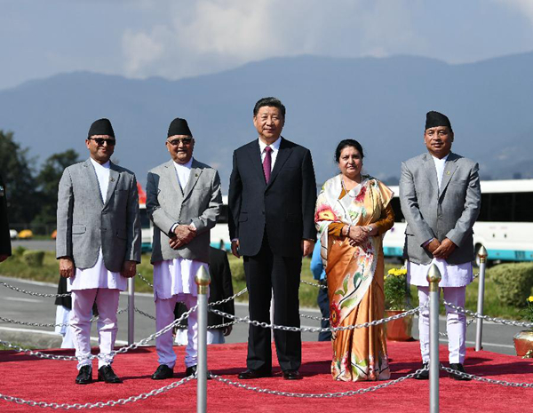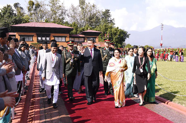 10月12日,國(guó)家主席習(xí)近平乘專(zhuān)機(jī)抵達(dá)加德滿(mǎn)都,開(kāi)始對(duì)尼泊爾進(jìn)行國(guó)事訪問(wèn)。尼泊爾總統(tǒng)班達(dá)里在機(jī)場(chǎng)為習(xí)近平舉行具有濃郁尼泊爾民族特色的歡迎儀式。新華社記者高潔攝