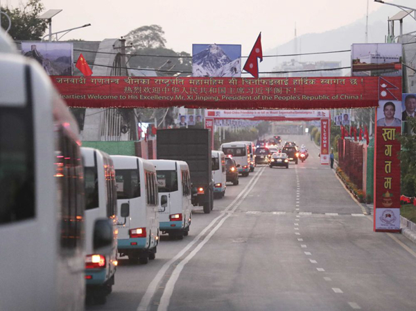 10月12日,尼泊爾首都加德滿(mǎn)都,車(chē)隊(duì)經(jīng)過(guò)一道道迎賓拱門(mén)。新華社記者丁林?jǐn)z