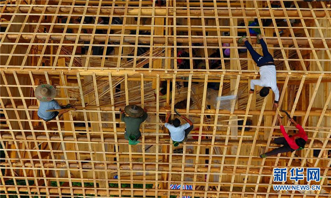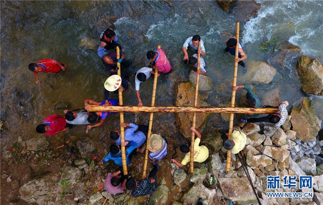 在黔桂烏英苗寨,群眾在幫助貧困戶(hù)吳仕足修建新木樓(9月3日無(wú)人機(jī)拍攝)。