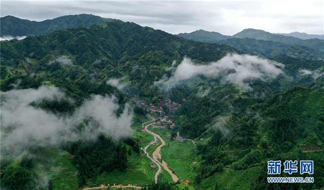 這是位于大山深處的黔桂烏英苗寨(7月6日無(wú)人機(jī)拍攝)。